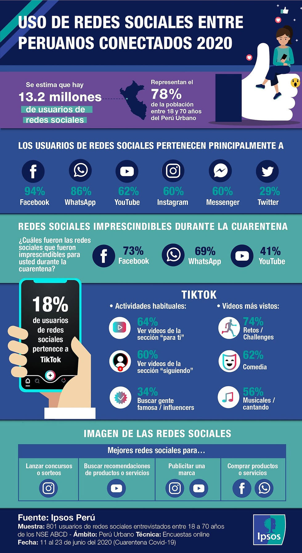 Esta gran diferencia en cuanto a seguidores entre estas dos redes sociales, puede ser debido a que según IPSOS, el 94% de peruanos pertenecen a la red social de Facebook, mientras que el 29% pertenece a Twitter y un 60% a Instagram. Además, el 73% de encuestados, consideró a Facebook como una red social imprescindible durante la cuarentena. Es importante tener en cuenta que IPSOS obtuvo estos resultados por medio de encuestas online, a hombres y mujeres de 18 a 70 años del Perú Urbano, quienes son usuarios frecuentes de Internet y poseen redes sociales.