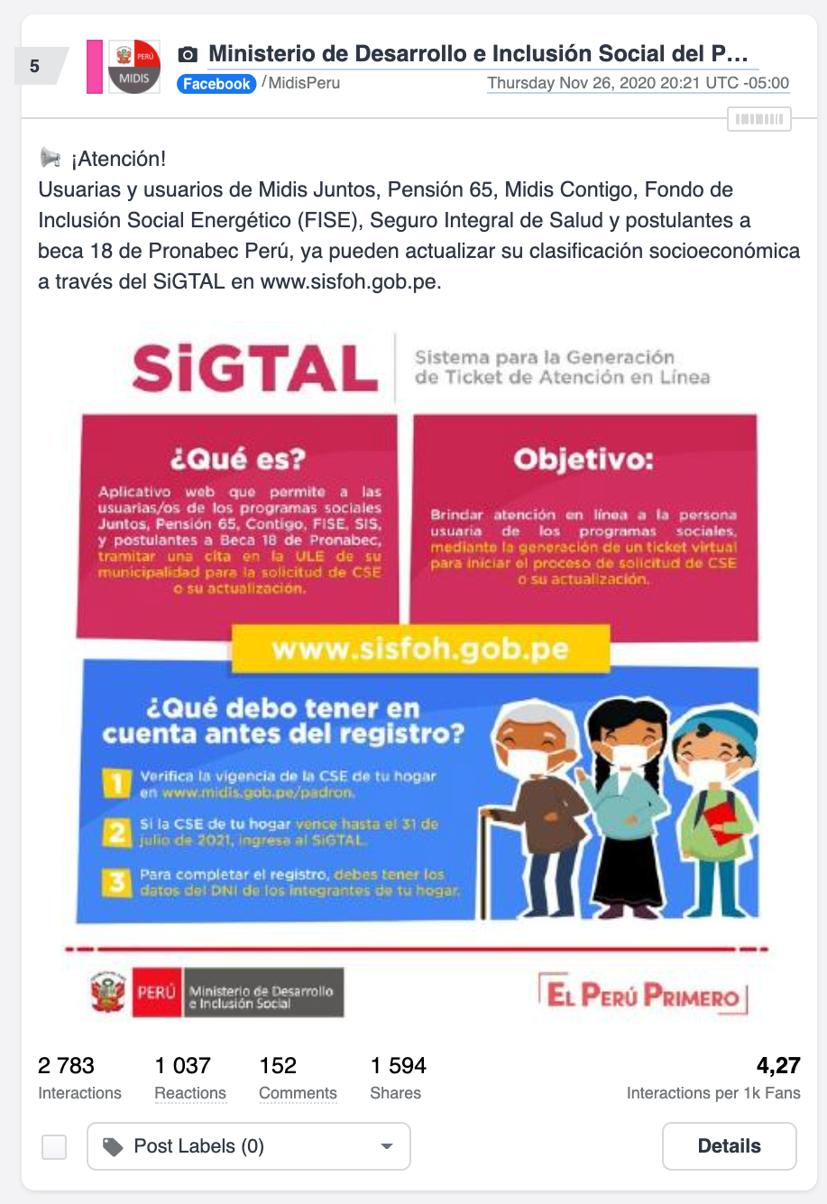 Toda esta información, se puede comprobar en las publicaciones que realiza el MIDIS en sus redes sociales y las interacciones que poseen por parte de sus seguidores. Mientras que en su cuenta de Facebook llegaron a 3.900 interacciones el 15 de noviembre, en Twitter la máxima cantidad fue de 93 interacciones el 19 de noviembre.